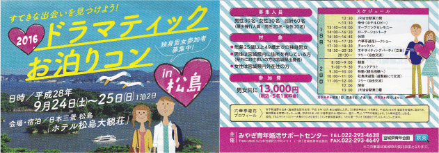 | みやぎ青年婚活サポートセンター(みやぎPISA)結婚相談随時実施(予約制) 〒983−0836 仙台市宮城野区幸町四丁目5番1号 (一般財団法人宮城県青年会館2F) TEL 022(293)4638 FAX 022(293)4649 受付時間 10:00〜17:00 |