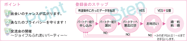 | 「ジョイフルふれあいパーティー」とは… 結婚をしたいと思っている男女が会話を中心に出会いを楽しむ交流会です。 当「みやぎPISA」会員や入会を迷っている方、会員でない方も独身の方ならどなたでもご参加いただけます。参加した異性の方全員と順番に会話ができ、フリータイムもあります。 |